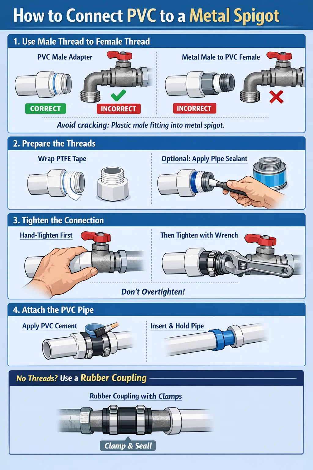Conectar tuberías de PVC a una llave de metal (grifo o válvula de metal) es una tarea común en las reparaciones de plomería del hogar. Debido a la diferente dureza y tasas de expansión/contracción térmica del plástico y el metal, se necesita especial cuidado durante la conexión para evitar fugas o accesorios agrietados.