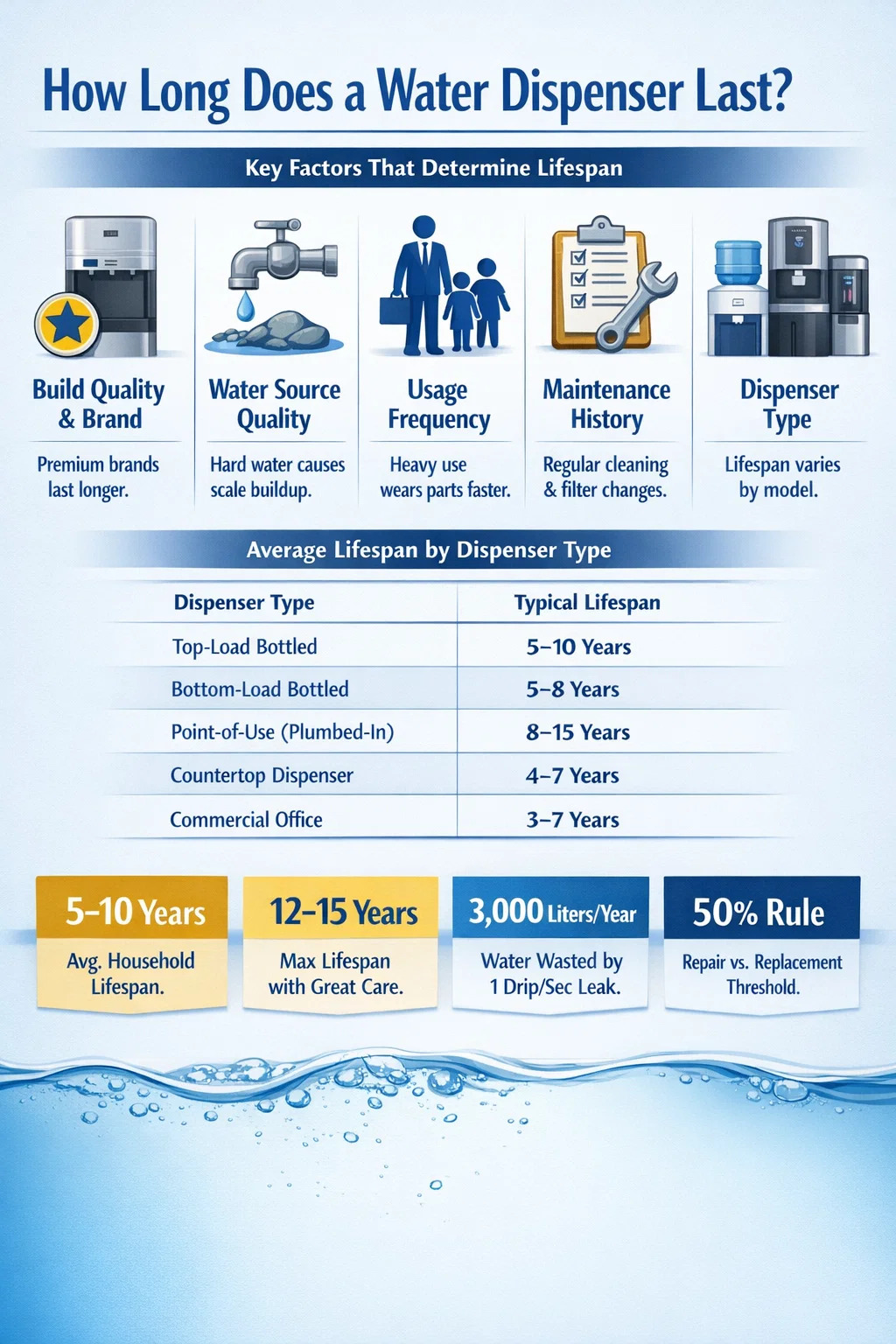 No todos los dispensadores de agua envejecen al mismo ritmo. Varias variables juegan un papel importante en cuántos años puede esperar de manera realista de su unidad antes de que el rendimiento disminuya o las piezas comiencen a fallar.