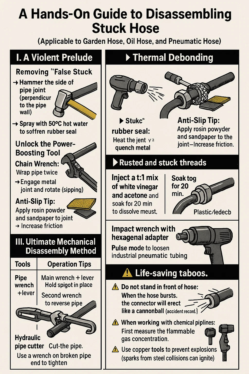 Barra tramposa de llave para tubos | Bloquee la llave primaria espiga → Manguera de contraagarre con segunda llave → Par de torsión con mango cruzado | Accesorios de manguera de metal | Pies bien apoyados: evita que la cara se plante cuando se suelta |