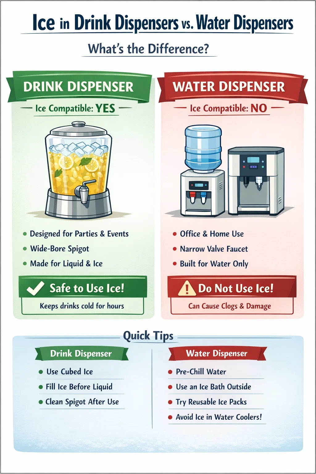 Para los dispensadores de bebidas especialmente diseñados (del tipo que se vende en tiendas de suministros para restaurantes, tiendas de alquiler para fiestas y minoristas de utensilios de cocina), el hielo no sólo es aceptable, sino que se espera. Estas unidades generalmente están hechas de plástico, acrílico o acero inoxidable sin BPA con aberturas de boca ancha y grifos diseñados para pasar líquido alrededor o a través del hielo parcialmente derretido sin obstruirse.