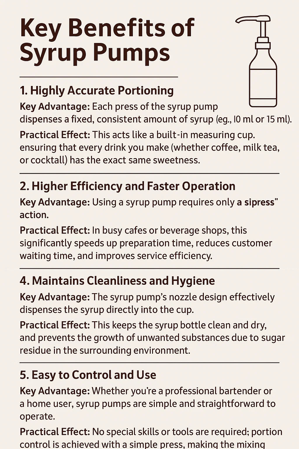 Ventaja clave: El uso de una bomba de jarabe requiere solo una única acción de **"presionar"**, lo que elimina múltiples pasos como abrir la tapa de la botella, verter, encontrar una taza medidora y luego cerrar la tapa.