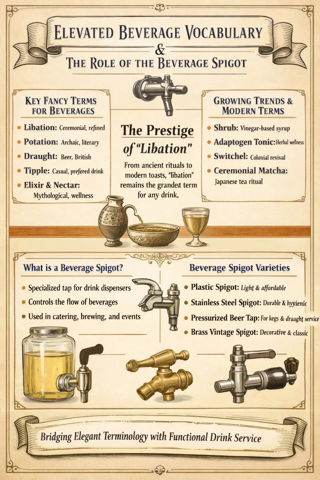 Cada uno de estos ejemplos muestra cómo las bebidas funcionales adquieren nombres elegantes a través de préstamos culturales, resurgimientos históricos o marcas deliberadas. El impulso humano subyacente (elevar lo que bebemos con un lenguaje que indique cuidado, tradición o sofisticación) permanece constante incluso cuando las palabras específicas cambian. Y al final de cada evolución, siempre hay un grifo de bebida en algún lugar, vertiendo la bebida del recipiente al vaso, cerrando la brecha entre una libación artesanal y un bebedor satisfecho.