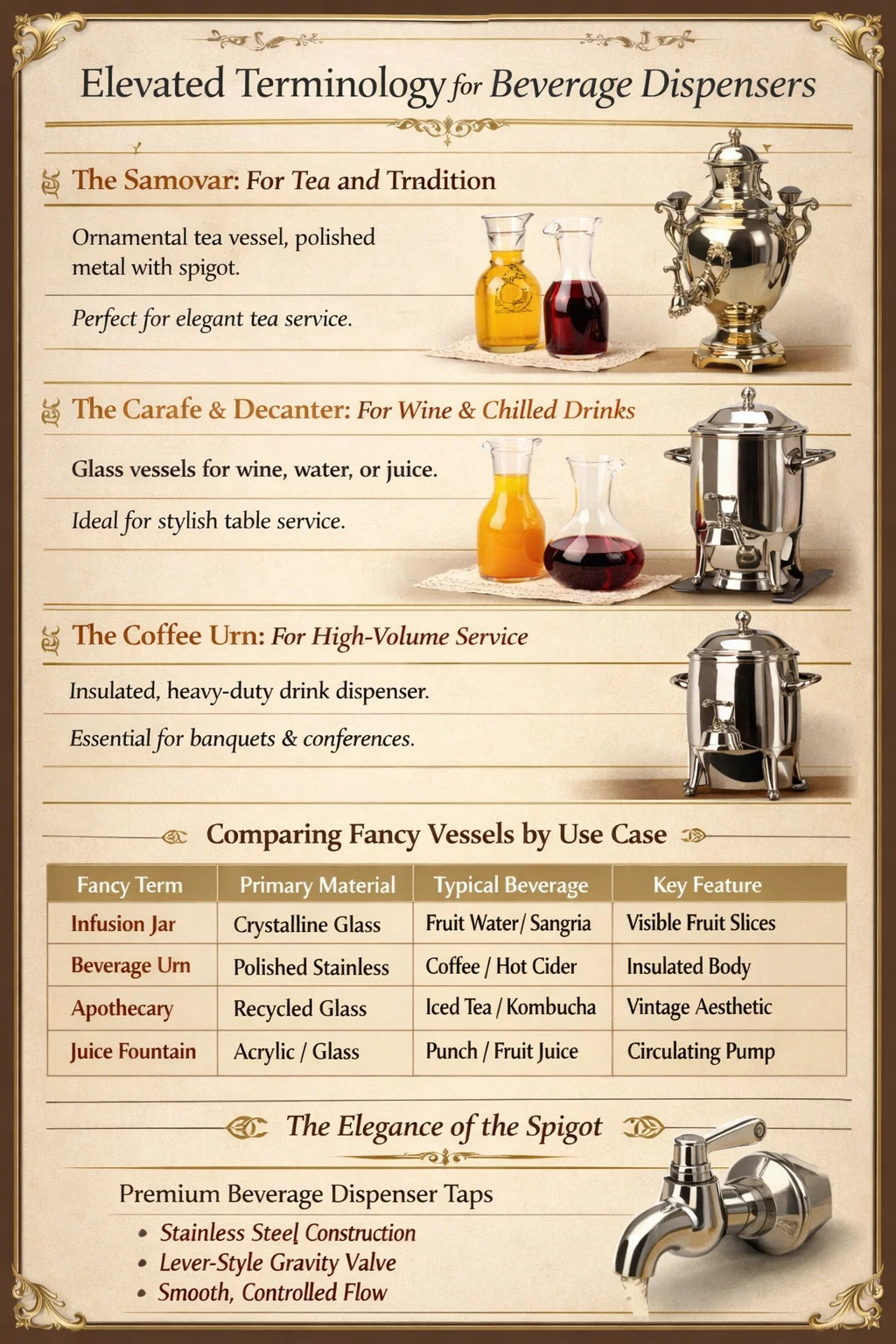 Si busca una palabra elegante para un dispensado de bebidas, los términos más precisos dependen del diseño específico y el contexto del recipiente. Para reuniones sociales elegantes, los términos "Jarra", "Decantador", "Samovar" o "Urna" se utilizan con frecuencia. En la restauración profesional y la hostelería de alta gama, estos artículos suelen denominarse "Jarras de Jugo" or "Tarros de infusión". Si bien una unidad estándar es funcional, una versión de lujo que presenta una alta calidad grifo dispensador de bebidas transforma un simple contenedor en una pieza central de equipo de servicio.